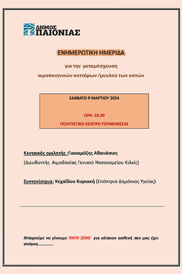Ενημερωτική ημερίδα για τη μεταμόσχευση αιμοποιητικών κυττάρων / μυελού των οστών θα πραγματοποιηθεί το Σάββατο 9 Μαρτίου στις 18:00 στο Πολιτιστικό κέντρο Γουμένισσας.