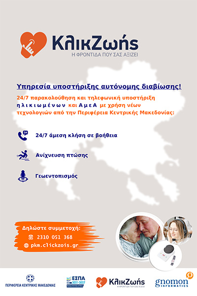 Η υπηρεσία τηλεϋποστήριξης της αυτόνομης διαβίωσης «Κλικ Ζωής» παρέχεται εντελώς δωρεάν από την Περιφέρεια Κεντρικής Μακεδονίας, με την υποστήριξη της ΓΝΩΜΩΝ ΠΛΗΡΟΦΟΡΙΚΗΣ Α.Ε., τόσο προς τους ηλικιωμένους κατοίκους όσο και προς τους ΑμεΑ κατοίκους της Περιφέρειας, προσφέροντάς τους εξατομικευμένη φροντίδα στην άνεση της οικείας τους.