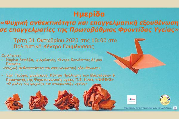 Η ημερίδα θα πραγματοποιηθεί την Τρίτη 31 Οκτωβρίου 2023, ώρα 18:00, στο Πολιτιστικό Κέντρο Γουμένισσας και απευθύνεται σε εργαζόμενους/ες νοσηλευτικής και σε επαγγελματίες ψυχικής υγείας των δομών Πρωτοβάθμιας Φροντίδας Υγείας του Δήμου Παιονίας.