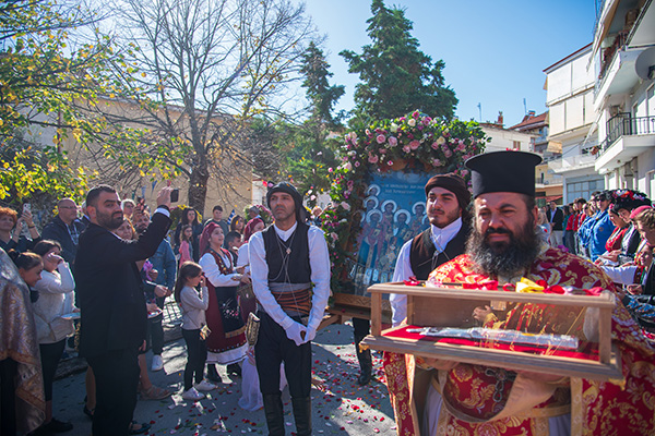 Αμέσως μετά την Θεία Λειτουργία στον προαύλειο χώρο του προαναφερθέντος Ιερού Ναού πραγματοποιήθηκε η υποδοχή των Ιερών Σεβασμάτων των Αγίων Πεντεκαίδεκα των Πολιούχων, τα οποία κόμισε Προϊστάμενος της Ενορίας τους, Αιδ. Πρωτ. π. Πολύκαρπος Κοντοζίδης, για να συναντηθούν ξανά με την παλαιά Εικόνα του Αγίου Μεγαλομάρτυρος Δημητρίου, στην οποία συμμετείχαν ο Λαός του Θεού, εκπρόσωποι της Ένωσης Ποντίων Ν. Κιλκίς "Αργοναύτες", του Συλλόγου Στενημαχιτών Κιλκίς "Ο Άγιος Τρύφων" και των Προσκόπων του Κιλκίς καθώς και των Αρχόντων του τόπου. Ανάμεσά τους ο Δήμαρχος Κιλκίς κ. Δημήτριος Κυριακίδης, ο Αντιπεριφερειάρχης Κιλκίς κ. Ανδρέας Βεργίδης, ο Πρόεδρος του Δημ. Συμβουλίου Κιλκίς κ. Παύλος Θωμαΐδης, ο Πρόεδρος της Κοινότητας Κιλκίς κ. Αθανάσιος Καριοφύλλης, ο Πρόεδρος της ΔΕΕΠ της ΝΔ κ. Μηνάς Παπαδόπουλος, ο Διοικητής της Πυροσβεστικής Κιλκίς κ. Ιωάννης Πολιτίδης, κ.α.