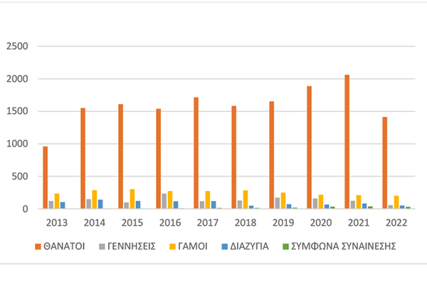 Τα συνολικά στοιχεία των ληξιαρχικών πράξεων για την (σχεδόν) δεκαετία 2013-2022 από όλα τα ληξιαρχεία του νομού έχουν ως εξής: