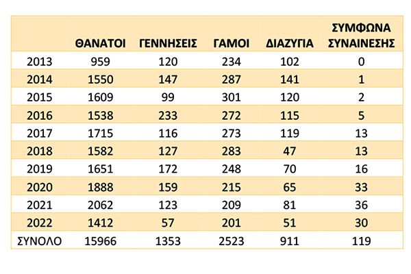 Αναλυτικά τα στοιχεία ανά έτος και ληξιαρχείο απεικονίζονται στους πίνακες που δημοσιεύουμε και αποτελούν προϊόν της επεξεργασίας την οποία κάναμε από τα επίσημα στοιχεία του Υπουργείου Εσωτερικών.