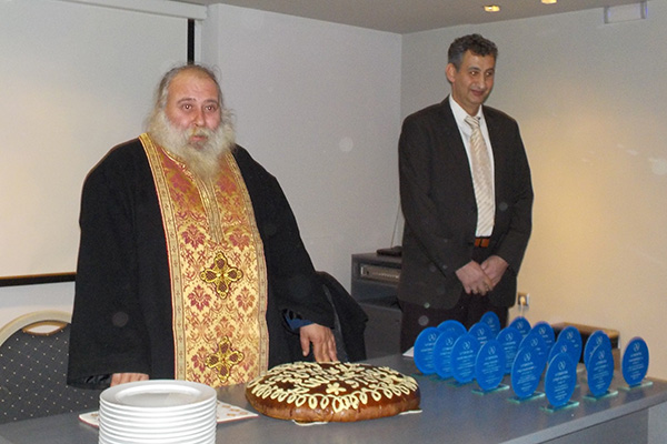 Ο πρόεδρος του Συλλόγου Τερζιάδης Γεώργιος αφού ο Πανοσιολογιότατος κ.κ. Γαβριήλ ευλόγησε κι έκοψε τη βασιλόπιτα του Συλλόγου ευχήθηκε σε όλους υγεία και ένα ευτυχές και δημιουργικό έτος. Στην ομιλία του μεταξύ άλλων ανέφερε ότι: « … θα πρέπει όλοι να συσπειρωθούμε γύρω από το Σύλλογό μας και να αγωνιστούμε, γιατί μόνο μέσα από την ενότητα και τη συλλογική δράση μπορούμε να πετύχουμε την επίλυση των καυτών προβλημάτων της Παιδείας…»