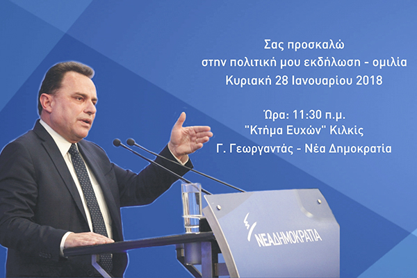 Μεγάλη εκδήλωση του βουλευτή Κιλκίς της Νέας Δημοκρατίας Γιώργου Γεωργαντά θα πραγματοποιηθεί στις 11:30 το πρωί της Κυριακής 28-1-2018, στο κέντρο Κτήμα των Ευχών στο Κιλκίς.
