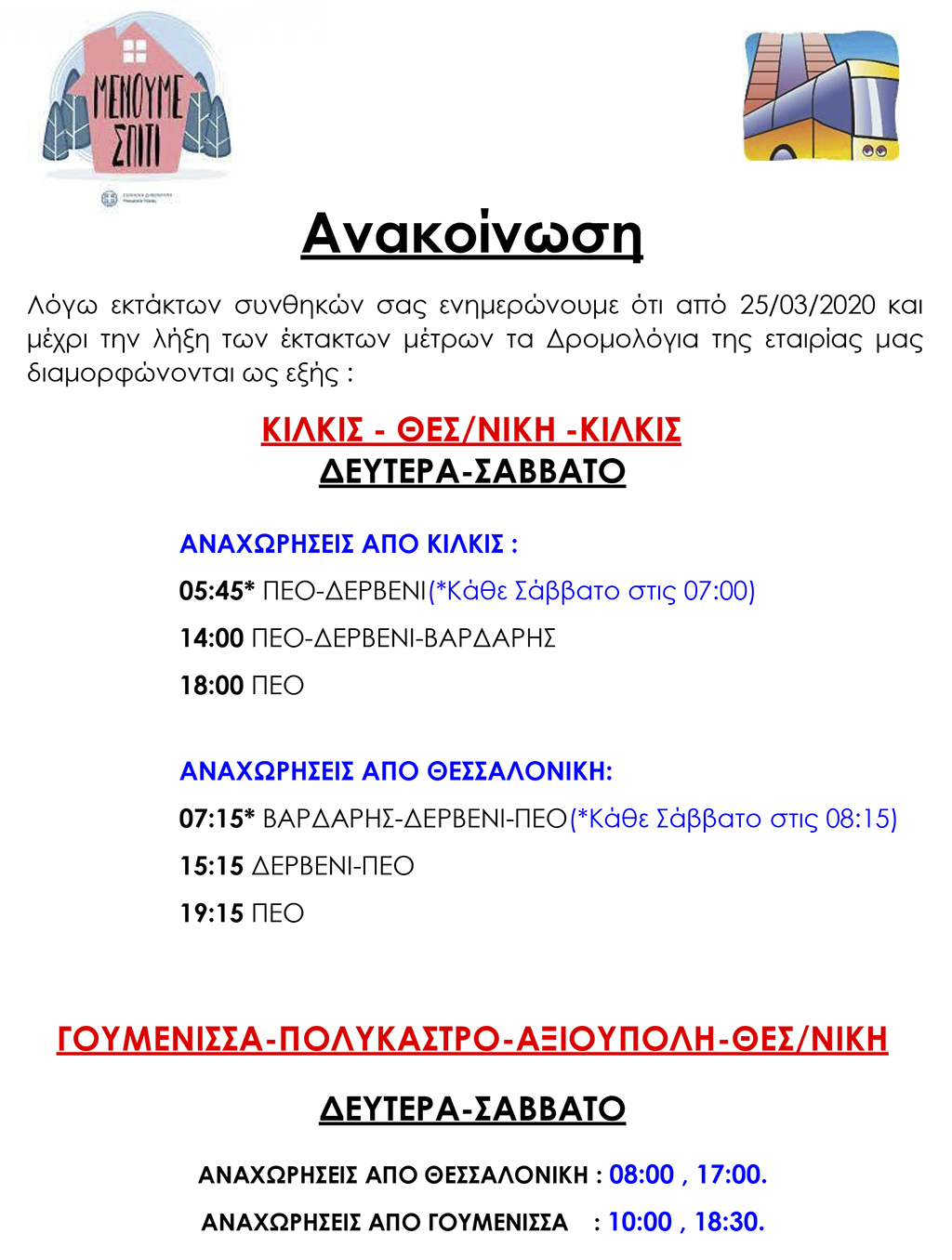Νέα και μειωμένα δρομολόγια θα έχουμε λόγω κορονοϊού και μέχρι τη λήξη των έκτακτων μέτρων από σήμερα στις γραμμές του ΚΤΕΛ Κιλκίς από και προς Θεσσαλονίκη.