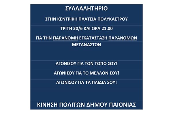 Νέο συλλαλητήριο στο Πολύκαστρο για την εγκατάσταση παράνομων μεταναστών οργανώνει η Κίνηση Πολιτών Δήμου Παιονίας. Το συλλαλητήριο θα γίνει την Τρίτη 30 Ιουνίου, στις 9 το βράδυ στην κεντρική πλατεία του Πολυκάστρου.