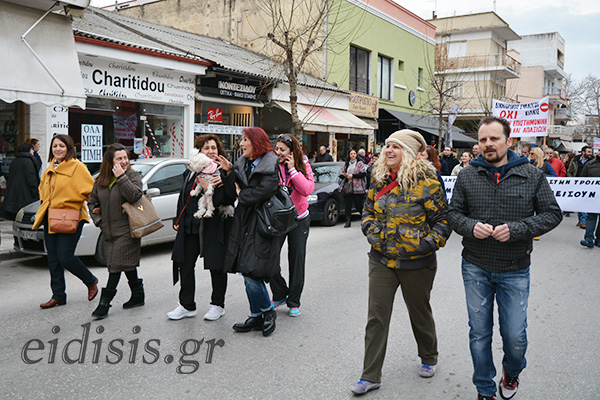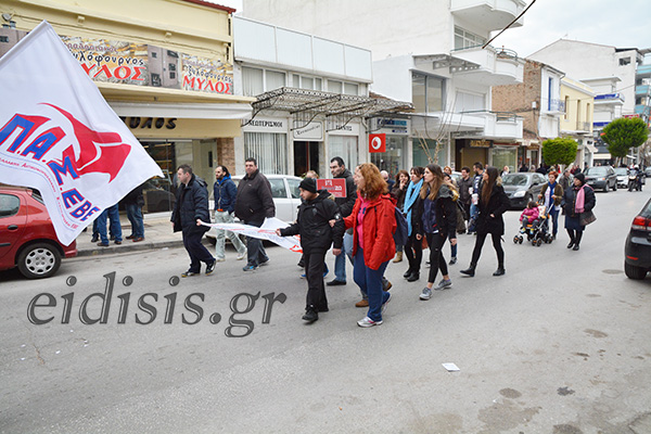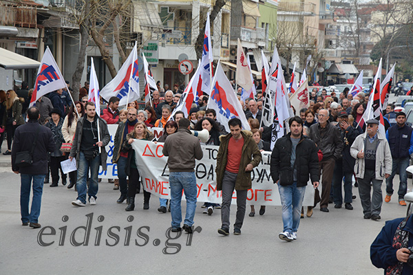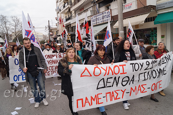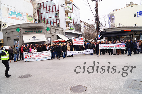 Φωνάζοντας συνθήματα κατά του ασφαλιστικού και του φορολογικού οι διαδηλωτές κατέληξαν στο Δημαρχείο, όπου αναγνώστηκαν ψηφίσματα διαμαρτυρίας.