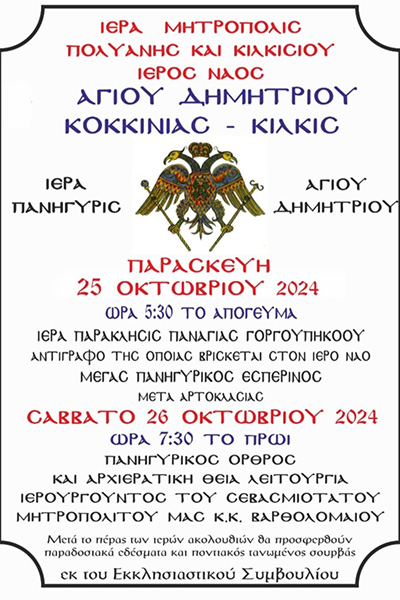 Ο Σεβασμιότατος Μητροπολίτης Πολυανής και Κιλκισίου Βαρθολομαίος θα ιερουργήσει στον Ι.Ν. Αγ. Δημητρίου Κοκκινιάς το Σάββατο 26 Οκτωβρίου 2024.