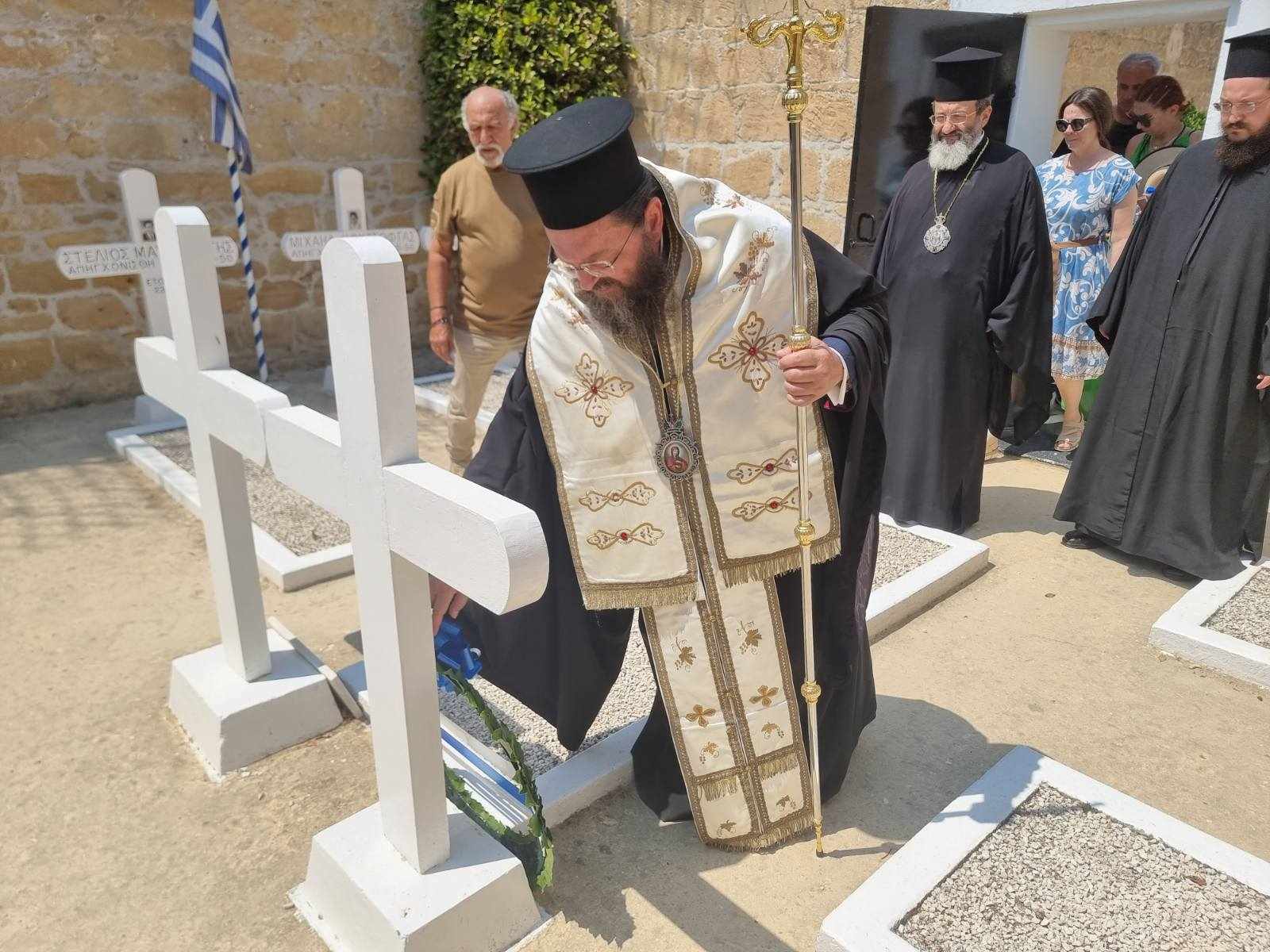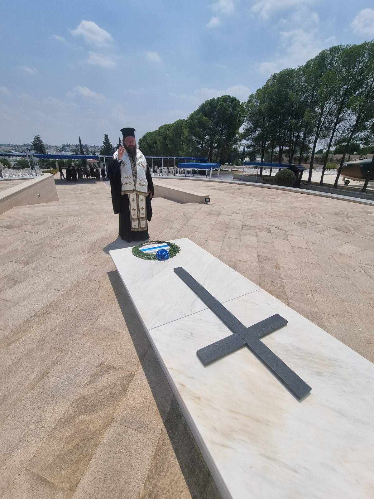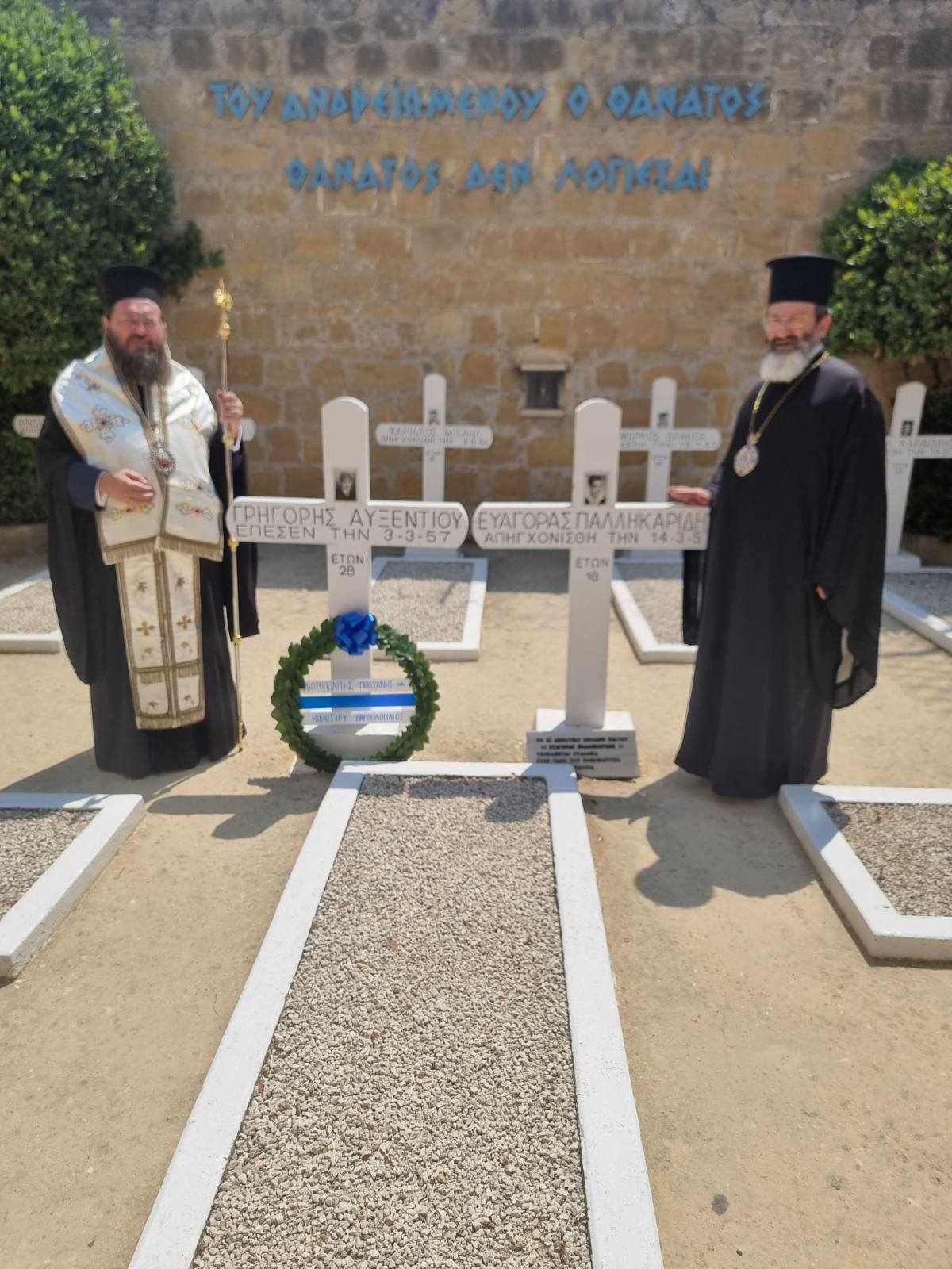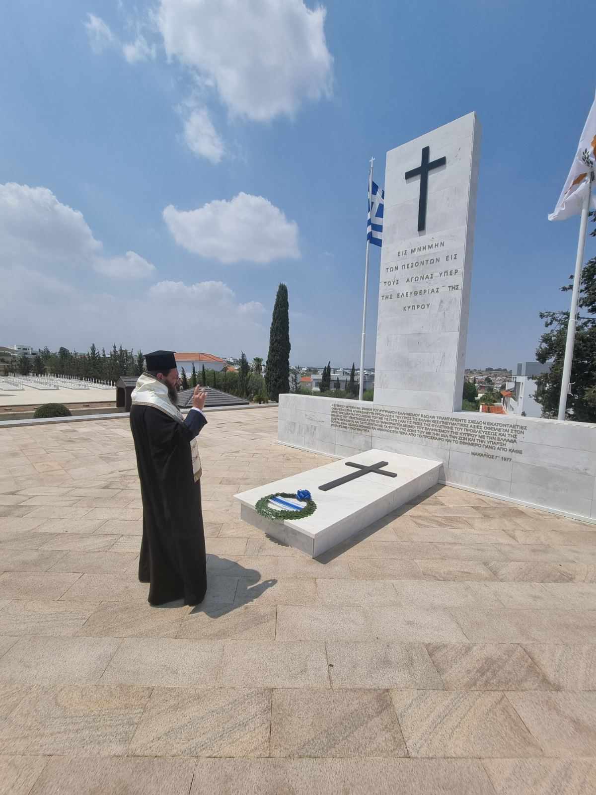 Ακολούθως, μαζί με τους προσκυνητές, τέλεσε Τρισάγιο στον Ήρωα Γρηγόρη Αυξεντίου στα Φυλακισμένα Μνήματα και στον Τύμβο της Μακεδονίτισσας για όσους έπεσαν στο καθήκον για το ύψιστο αγαθό της ελευθερίας, καταθέτοντας την προσευχή τους και αποτίοντας τον ελάχιστο φόρο τιμής καταθέτοντας στέφανο δάφνης.