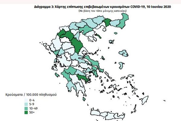 Πιο χαμηλά και με λιγότερα από 10 κρούσματα ανά 100.000 πληθυσμού ακολουθούν οι 13 νομοί, μεταξύ τους και του Κιλκίς. Και έσχατοι και τυχεροί οι τρεις νομού όπου ο ιός είναι ακόμα αφανής.