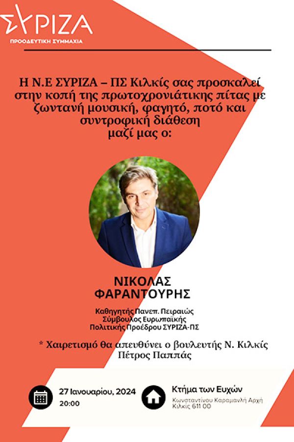 Η Νομαρχιακή Επιτροπή ΣΥΡΙΖΑ - ΠΣ Κιλκίς προσκαλεί τα μέλη και τους φίλους του στην εορταστική εκδήλωση κοπής της βασιλόπιτας το Σάββατο 27 Ιανουαρίου, 8 το βράδυ στο Κτήμα των Ευχών.