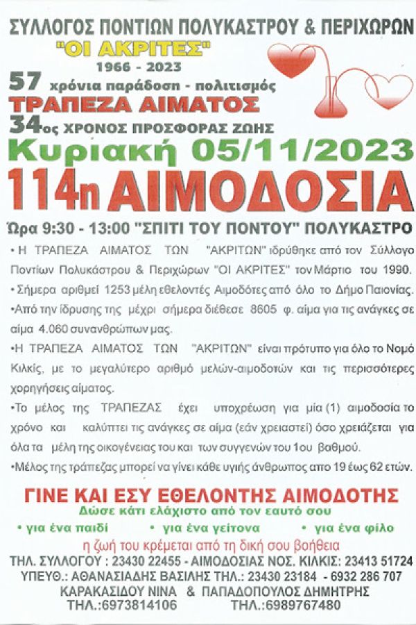 Έφτασε και πάλι η ώρα της έμπρακτης απόδειξης αγάπης, προς τον πάσχοντα συνάνθρωπό μας, οι "Ακρίτες" συνεπείς όπως πάντα και σύμφωνα με το ετήσιο πρόγραμμα αιμοδοσιών, πραγματοποιούν την 114η Εθελοντική Αιμοδοσία των μελών της Τράπεζας Αίματος, την Κυριακή 5 Νοεμβρίου 2023 και από τις 09:00 το πρωί έως τις 13:00 όπως πάντα στο "Σπίτι του Πόντου" στο Πολύκαστρο.