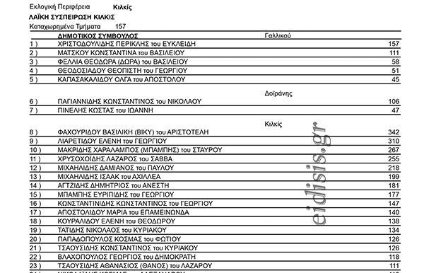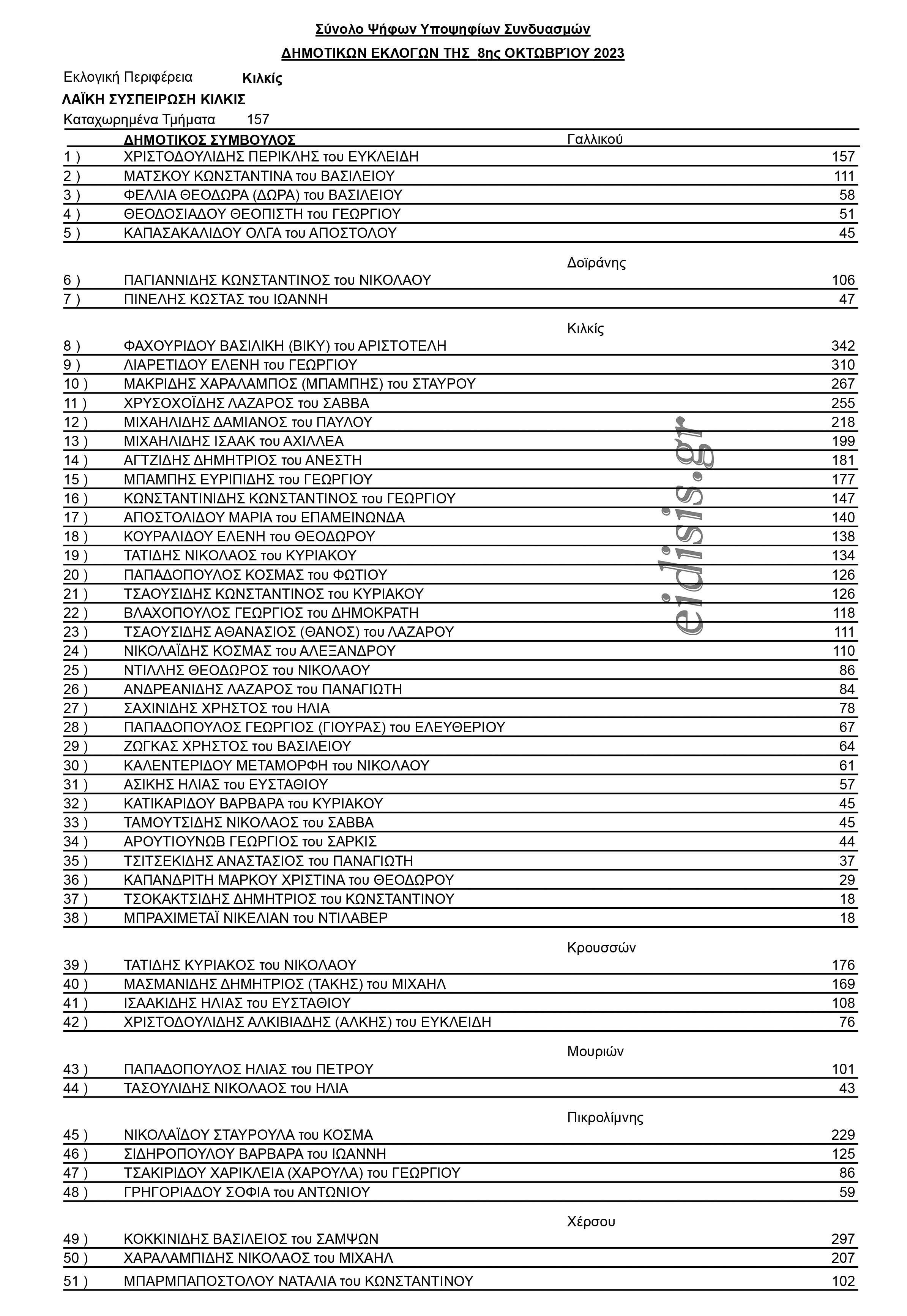 Με τα επίσημα αποτελέσματα όπως εκδόθηκαν από το Πρωτοδικείο Κιλκίς η σειρά κατάταξης σε σταυρούς προτίμησης των υποψηφίων δημοτικών συμβούλων του συνδυασμού της Λαϊκής Συσπείρωσης Κιλκίς παρουσιάζονται στο σχετικό πίνακα. Ανοίξτε τους πίνακες από την ΕΚΘΕΣΗ ΕΙΚΟΝΩΝ