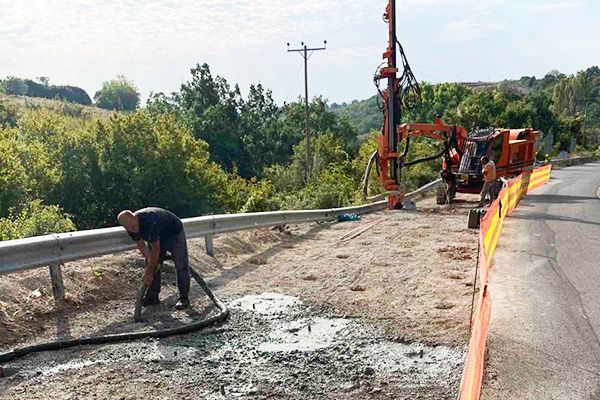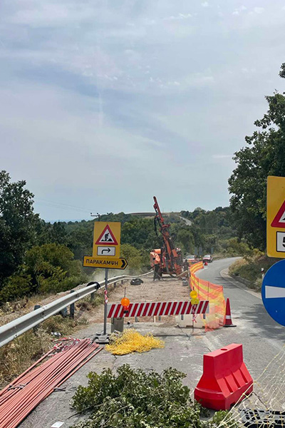 *Η κατασκευή ενθεμάτων Φ150mm και μήκους 6,65m ( δηλώσεις εδάφους/soil nailing) με ειδικό γεωτρητικό εξοπλισμό. Τα στοιχεία αυτά θα “ράψουν” την επιφάνεια ολίσθησης, θα βελτιώσουν και θα ενισχύσουν το σώμα της εδαφικής μάζας που κατολισθαίνει και τέλος θα θεμελιώσουν τα φορτία της κυκλοφορίας