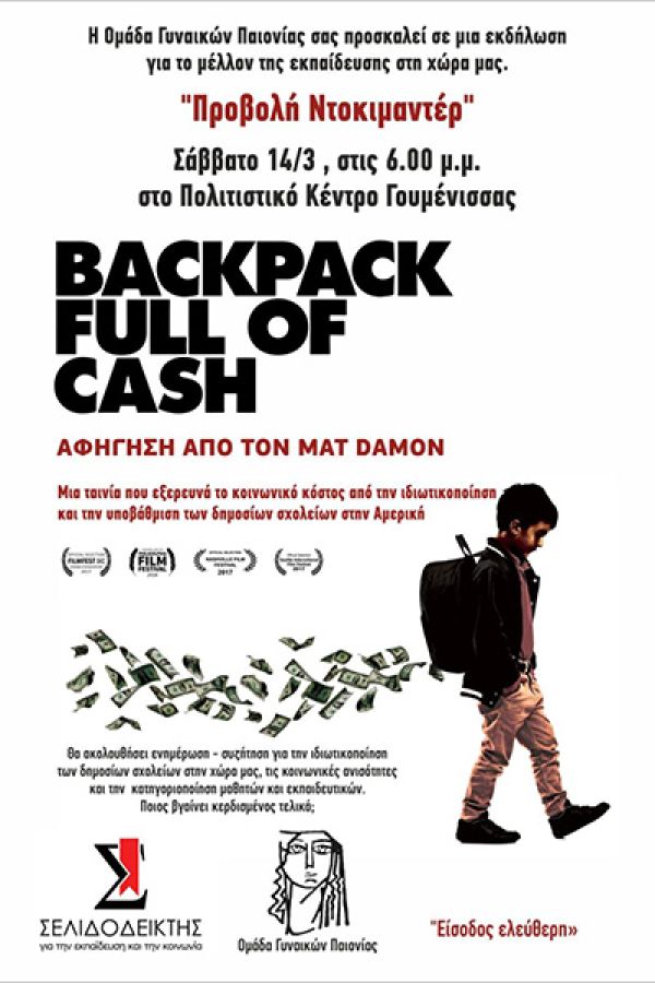 Στο πλαίσιο της εκδήλωσης θα πραγματοποιηθεί προβολή του ντοκιμαντέρ «Backpack Full of Cash», το οποίο εξερευνά τις επιπτώσεις της ιδιωτικοποίησης και της υποβάθμισης των δημόσιων σχολείων στις Ηνωμένες Πολιτείες της Αμερικής, αναδεικνύοντας το κοινωνικό κόστος που προκύπτει από αυτές τις πολιτικές.