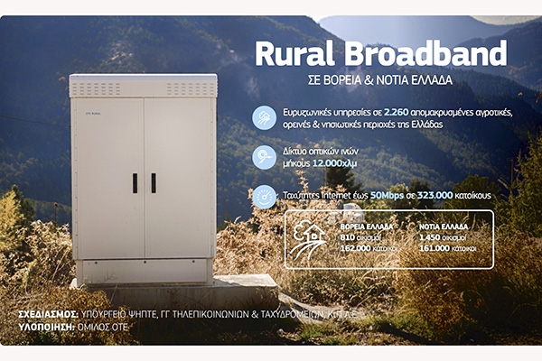 Ένα έργο πνοής για τις απομακρυσμένες περιοχές της βόρειας και της νότιας Ελλάδας ολοκλήρωσε επιτυχώς ο Όμιλος ΟΤΕ. Στο πλαίσιο του έργου Rural Broadband, ο Όμιλος δημιούργησε νέο δίκτυο οπτικών ινών μήκους 12.000 χιλιομέτρων, μέσω του οποίου αποκτούν πρόσβαση σε γρήγορο Internet έως 50Mbps, 323.000 κάτοικοι αγροτικών, ορεινών και νησιωτικών περιοχών σε 2.260 απομακρυσμένες περιοχές της χώρας.