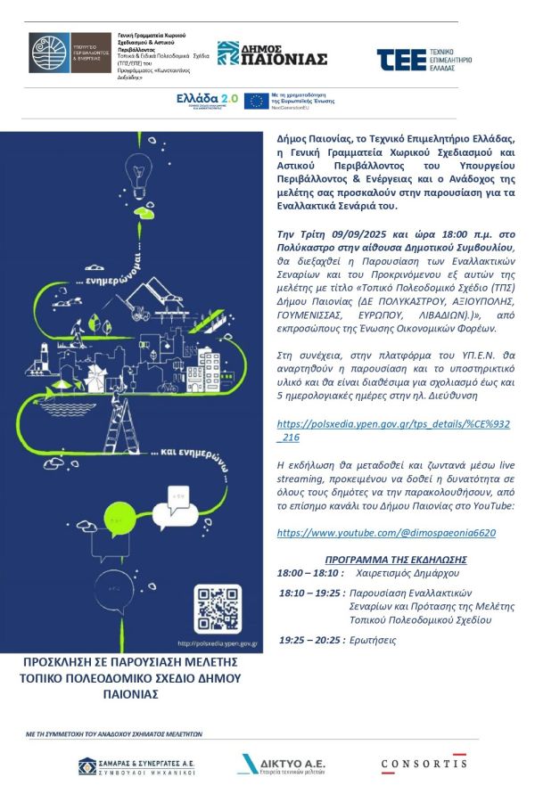θα γίνει η παρουσίαση των εναλλακτικών σεναρίων και του προτεινόμενου εξ αυτών της μελέτης του «Τοπικού Πολεοδομικού Σχεδίου Δήμου Παιονίας», από τους εκπροσώπους της Ένωσης Οικονομικών Φορέων.