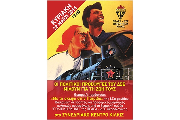 Το Παράρτημα Κιλκίς της ΠΕΑΕΑ – ΔΣΕ θα πραγματοποιήσει εκδήλωση με θέμα: «Οι Πολιτικοί Πρόσφυγες του Δ.Σ.Ε.», την Κυριακή 22 Μαΐου 2016, στις 7:00 μ.μ., στο Συνεδριακό Κέντρο Κιλκίς, όπου θα παρουσιαστεί η θεατρική παράσταση της Ιωάννας Στεφανίδου: «Με τη σκέψη στην Πατρίδα».