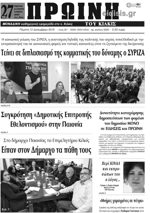 Πέντε χρόνια πριν. Διαβάστε τι έγραφε η καθημερινή εφημερίδα ΠΡΩΙΝΗ του Κιλκίς στις 12-12-2019