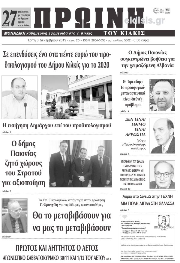 Πέντε χρόνια πριν. Διαβάστε τι έγραφε η καθημερινή εφημερίδα ΠΡΩΙΝΗ του Κιλκίς στις 3-12-2019