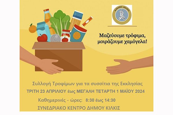 Στο Φουαγιέ του Συνεδριακού Κέντρου Κιλκίς θα συγκεντρώνονται βασικά είδη επισιτιστικής συνδρομής: λάδι,όσπρια (φασόλια, ρεβίθια, φακές), μακαρόνια, ρύζι,κριθαράκι, σάλτσες, γάλα μακράς διαρκείας, κασέρι, ζάχαρη, αλάτι, πιπέρι, λεμόνι, ξύδι.