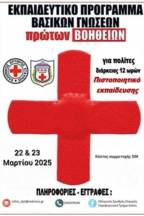 Το Περιφερειακό Τμήμα Ερυθρού Σταυρού Κιλκίς ανακοινώνει την πραγματοποίηση 12ωρου πιστοποιημένου σεμιναρίου Πρώτων Βοηθειών στις 22&23 Μαρτίου 2025.