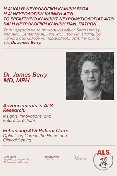 Η Ελλάδα υποδέχθηκε πρόσφατα έναν από τους κορυφαίους ερευνητές παγκοσμίως στον τομέα της Πλάγιας Αμυοτροφικής Σκλήρυνσης (ALS), τον καθηγητή James Berry, MD, MPH, από το Harvard, υπεύθυνο του τμήματος ALS στο Νοσοκομείο της Μασαχουσέτης (M.G.H.), κατόπιν πρωτοβουλίας της οικογένειας Τζίκα της ELVIAL. Κατά την επίσκεψή του, ο καθηγητής Berry μίλησε για τις ελπιδοφόρες εξελίξεις στον τομέα της θεραπείας της ALS, τονίζοντας τη σημασία της συνεργασίας και της καινοτομίας.