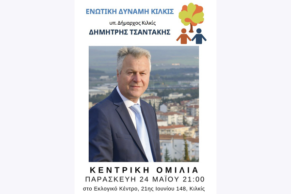 Σήμερα στις 9 το βράδυ η μεγάλη κεντρική συγκέντρωση της Ενωτιής Δύναμης Κιλκίς, του υπ. δημάρχου Κιλκίς Δημήτρη Τσαντάκη, στο εκλογικό του κέντρο, 21ης Ιουνίου 148, στο Κιλκίς.