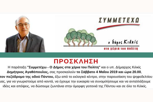Σήμερα το βράδυ, στις 8μ.μ., θα γίνει... μετά μουσικής η παρουσίαση του συνδυασμού του υποψήφιου δημάρχου Κιλκίς Δημήτρη Αγαθόπουλου, στον πεζόδρομο της Πόντου και στο εκλογικό κέντρο του συνδυασμού "Συμμετέχω - Ο Δήμος στα χέρια του Πολίτη".