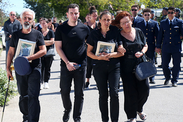 Τραγικές φιγούρες οι γονείς του, που έφτασαν στην εκκλησία κρατώντας στα χέρια δυο φωτογραφίες του γιου τους, όπου απεικονίζεται εν ώρα πτήσης και με την επίσημη ενδυμασία του Σώματος. Ο πατέρας του κρατούσε το επίσημο ξίφος που είχε ως αξιωματικός της Πολεμικής Αεροπορίας.