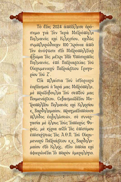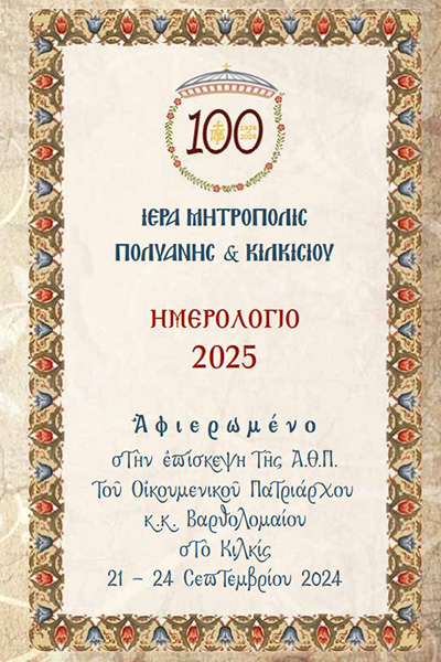 Στο μήνυμά του ο Σεβασμιώτατος Μητροπολίτης Πολυανής και Κιλκισίου κ. Βαρθολομαίος τονίζει χαρακτηριστικά: «Αφήνουμε πίσω μας μία χρονιά μεγάλης πνευματικής αγαλλίασης και ευλογίας. Κατά το έτος 2024 συμπληρώθηκαν, με τη χάρη του Θεού, 100 χρόνια από της ανυψώσεως της Επισκοπής Πολυανής σε Ιερά Μητρόπολη Πολυανής και Κιλκισίου. Στα γενέθλια αυτά της εκκλησιαστικής μας επαρχίας αντανακλά μία ήδη διανυθείσα πορεία πλούσιας πνευματικής προσφοράς, θεολογικής διάπλασης και ψυχικής σωτηρίας. Τα αγαθά αυτά, μάλιστα, κατέχουν μία ιδιαίτερη σημασία, καθόσον προσφέρθηκαν στο τίμιο και μαρτυρικό έδαφος του Κιλκίς, της εσχατιάς της πατρίδας μας.