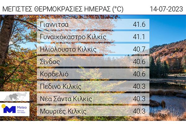 Πάνω από 40 βαθμούς είχαμε σχεδόν σε όλο το νομό Κιλκίς, με καταγραφές: Ηλιόλουστο 40,7 και 40,3 σε Πεδινό, Νέα Σάντα και Μουριές.