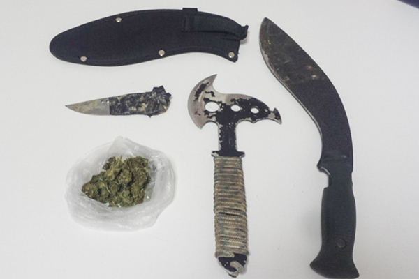 βρέθηκαν και κατασχέθηκαν ποσότητα κάνναβης βάρους 9,8 γραμμαρίων, ένα τσεκούρι, ένα μαχαίρι με μήκος λάμας 27 εκατοστών και ένα μαχαίρι με αυτοσχέδια λαβή.