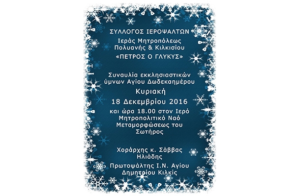 Ο ΣΥΛΛΟΓΟΣ ΙΕΡΟΨΑΛΤΩΝ Ιεράς Μητροπόλεως Πολυανής & Κιλκισίου «ΠΕΤΡΟΣ Ο ΓΛΥΚΥΣ» θα δώσει συναυλία εκκλησιαστικών ύμνων Αγίου Δωδεκαημέρου, την Κυριακή 18 Δεκεμβρίου 2016 και ώρα 18.00 στον Ιερό Μητροπολιτικό Ναό Μεταμορφώσεως του Σωτήρος.