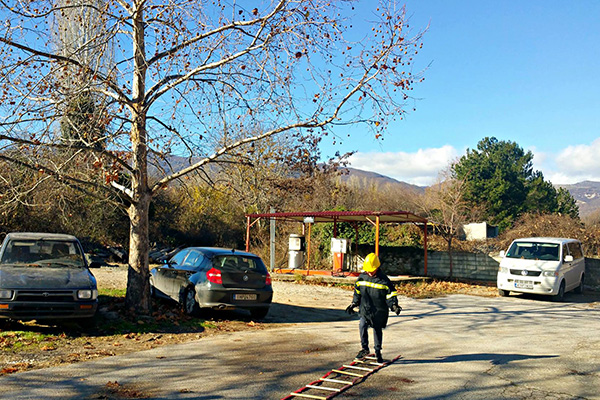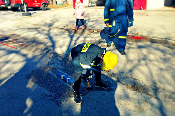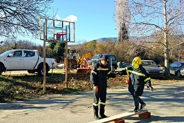 Στο τέλος της επίσκεψης προτείναμε στους συνοδούς να διαμορφώσουμε στον προαύλιο χώρο της Υπηρεσίας ένα μικρό πρωτότυπο «στίβο πυροσβεστικών δοκιμασιών» προσαρμοσμένο στην μικρή ηλικία των παιδιών ώστε να συμμετέχουν ενεργά στην διαδικασία προετοιμασίας – εκπαίδευσης και ρίψης νερού σε στόχο. Συγκεκριμένα διαμορφώσαμε έξι (6) μικρούς σταθμούς «πυροσβεστικών δραστηριοτήτων» όπως παρακάτω :
