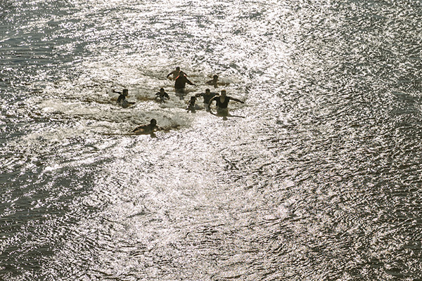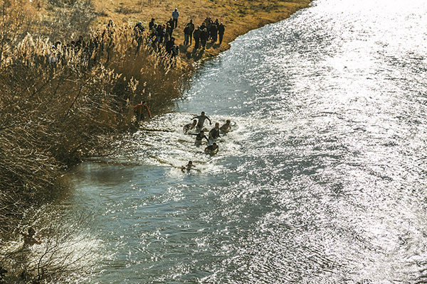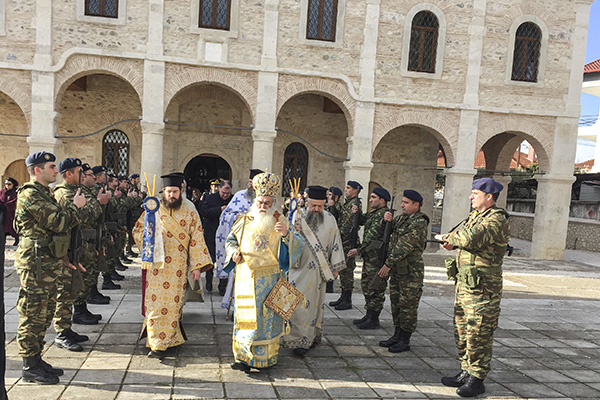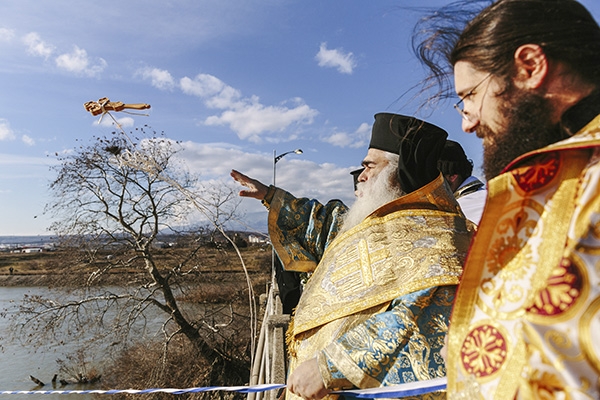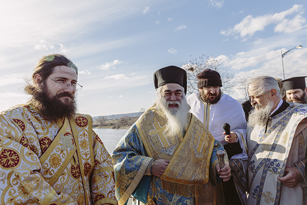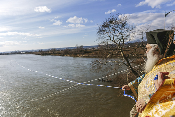 Η συνέχεια δόθηκε στον Αξιό, το μεγάλο ποτάμι που διαπερνά εγκάρσια τα δύο μέρη της συνοριακής μας Μητρόπολης από την Ειδομένη μέχρι τη Γέφυρα. Ο αέρας πολύ δυνατός και κατάψυχρος, δε στάθηκε ικανός να αποτρέψει την προσέλευση και τη συμμετοχή των πιστών, σε όλο το μήκος της γέφυρας, αλλά και στις όχθες του ποταμού. Τελέστηκε και πάλι η τελετή αγιασμού των υδάτων και της φύσης, με την επίκληση της ευλογίας του Σωτήρος Χριστού και τη ρίψη του Τιμίου Σταυρού. Προεξήρχε ο Ποιμενάρχης μας κ. Δημήτριος επικεφαλής μιας φιλεόρτου κληρικολαϊκής εκπροσώπησης από Γουμένισσα, Αξιούπολη και Πολύκαστρο, φορείς των τοπικών Αρχών με επικεφαλής το Δήμαρχο Παιονίας κ. Χρήστο Γκουντενούδη και αντιδημάρχους, ο Βουλευτής κ. Γεώργιος Γεωργαντάς, ο εκπρόσωπος του διοικητή της 33ης Μ/Κ Ταξιαρχίας και αξιωματικοί. Και βεβαίως, οι ριψοκίνδυνοι που έπεσαν στα παγωμένα νερά του ποταμού, για να πιάσουν τον Τίμιο Σταυρό.