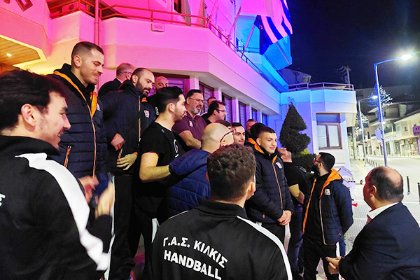Περιχαρείς οι αθλητές της ομάδας, συνοδευόμενοι από τη διοικητική ηγεσία του ΓΑΣΚ αφίχθηκαν, υπό βροχή λίγο πριν τις 11 το βράδυ στο Δημαρχείο, όπου τους υποδέχθηκε ο Δήμαρχος Κιλκίς Δημήτρης Κυριακίδης και συνεχάρη έναν – έναν ξεχωριστά τους παίκτες και τους διοικητικούς παράγοντες για τη μεγάλη επιτυχία που κατέγραψαν.