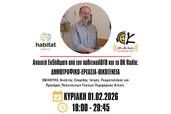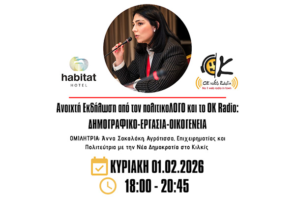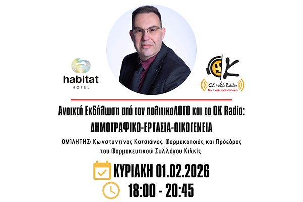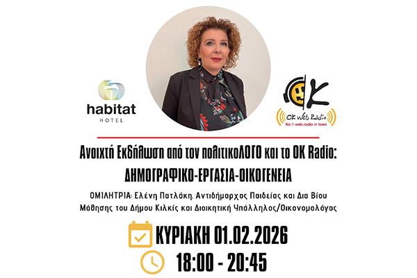Δημογραφικό - Εργασία - Οικογένεια! Ανοιχτή Εκδήλωση με κεντρικό θέμα ένα σοβαρό κοινωνικό ζήτημα, έναν γνήσιο και σύγχρονο προβληματισμό, μέσα στην ρεαλιστική καθημερινότητα και την Ελληνική, Ευρωπαϊκή, Δυτική πραγματικότητα του σήμερα. Ένα θέμα καθαρά πατριωτικό, όσο και ξεκάθαρα προοδευτικό. 8 ομιλήτριες/ομιλητές, 4 πάνελ και 1 moderator. Στον ζεστό, φιλόξενο και ήρεμο χώρο του Habitat Hotel Κιλκίς.