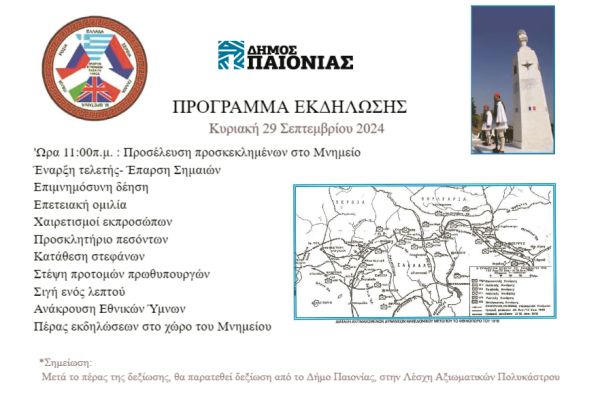 Ο δήμος Παιονίας διοργανώνει την Κυριακή 29 Σεπτεμβρίου την 106η Επέτειο της Διάσπασης του Μακεδονικού Μετώπου τον Σεπτέμβριο του 1918. Η εκδήλωση θα γίνει στο Διασυμμαχικό Μνημείο Πολυκάστρου, στις 11 το πρωί, ενώ θα ακολουθήσει δεξίωση στη Λέσχη Αξιωματικών Πολυκάστρου.