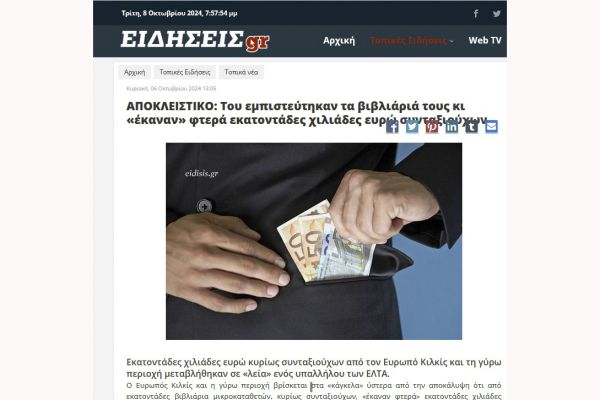 Όλα τα δημοσιεύματα και τα τηλεοπτικά ρεπορτάζ στηρίχτηκαν στο αναλυτικό ρεπορτάζ του eidisis.gr, της περασμένης Κυριακής, και στην εγκυρότητα του Δημοσιογραφικού Οργανισμού των ΕΙΔΗΣΕΩΝ.