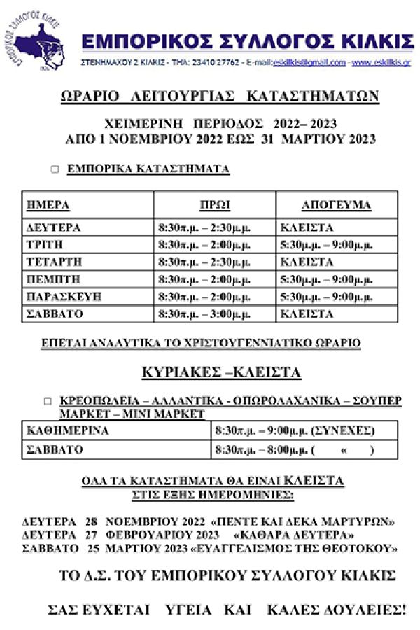 Χειμερινό ωράριο καταστημάτων στο Κιλκίς από την Τρίτη 1 Νοεμβρίου 2022