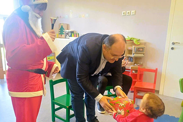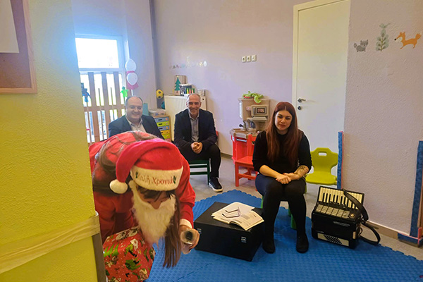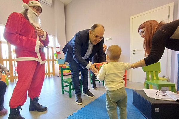 Οι δύο άνδρες, με τη βοήθεια του Αϊ – Βασίλη, μοίρασαν χριστουγεννιάτικα δώρα στα μικρά παιδιά και αντάλλαξαν εγκάρδιες ευχές με το προσωπικό του Δημοτικού Βρεφικού Σταθμού για τα Χριστούγεννα και τις γιορτές του Δωδεκαημέρου.