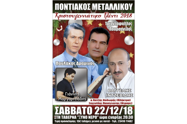 Μια υπέροχη βραδιά ετοιμάζει ο Ποντιακός Σύλλογος Μεταλλικού για το Σάββατο 22 Δεκεμβρίου, στην ταβέρνα "Ξυνό Νερό", με εξαιρετικούς πόντιους καλλιτέχνες και υπέροχο φαγητό.