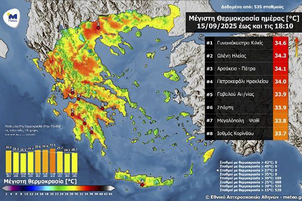 Στον χάρτη της εικόνας που ακολουθεί παρουσιάζεται η κατανομή της μέγιστης θερμοκρασίας στη χώρα καθώς και οι 8 σταθμοί με τις υψηλότερες μέγιστες.
