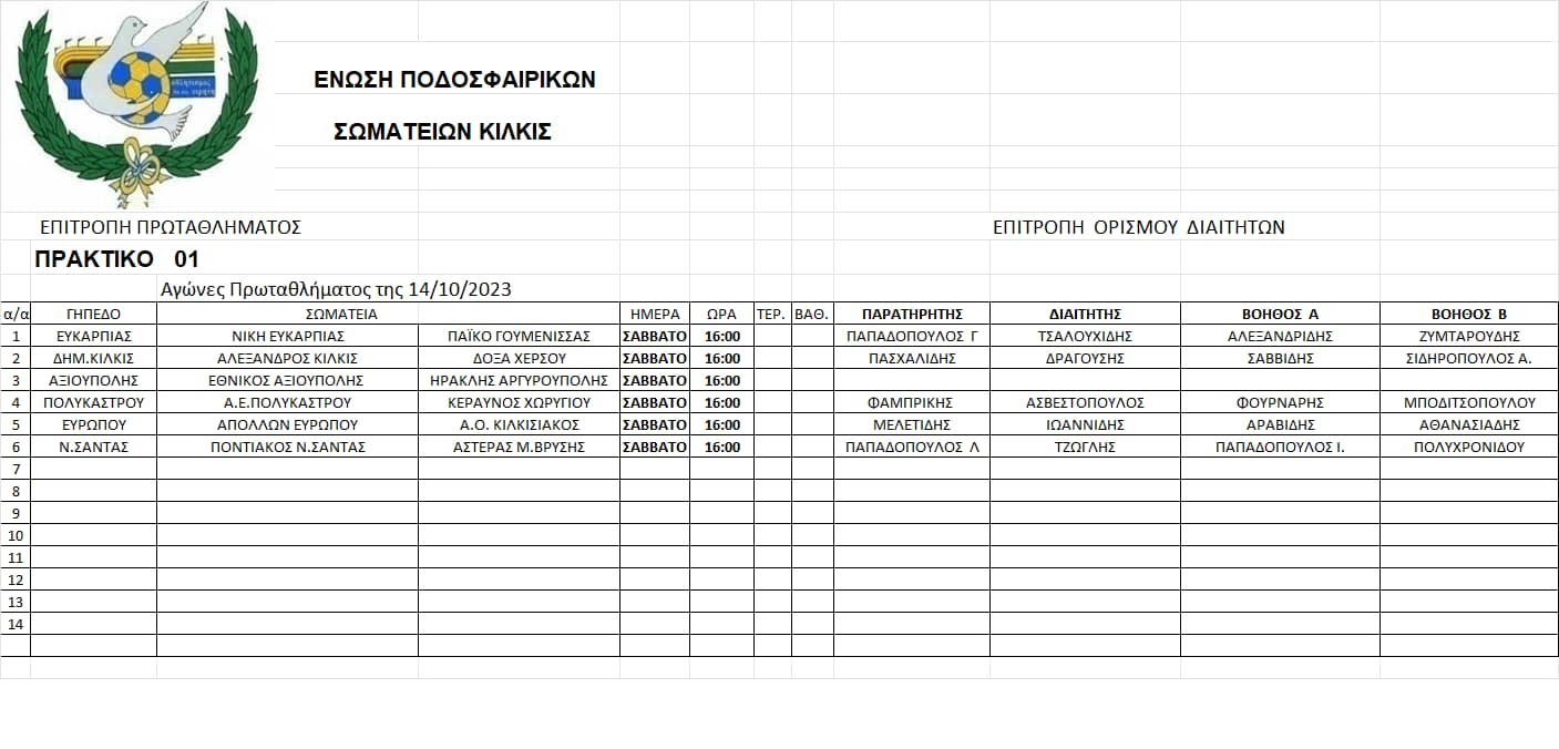 Από την Επιτροπή Ορισμού Διαιτητών της ΕΠΣ Κιλκίς ορίσθηκαν οι παρατηρητές και οι διαιτητές που θα διευθύνουν τους αγώνες της Α1 κατηγορίας το Σάββατο 14 Οκτωβρίου 2023, στις 4 το απόγευμα, όπως καταγράφονται στο σχετικό πίνακα στην έκθεση εικόνων.