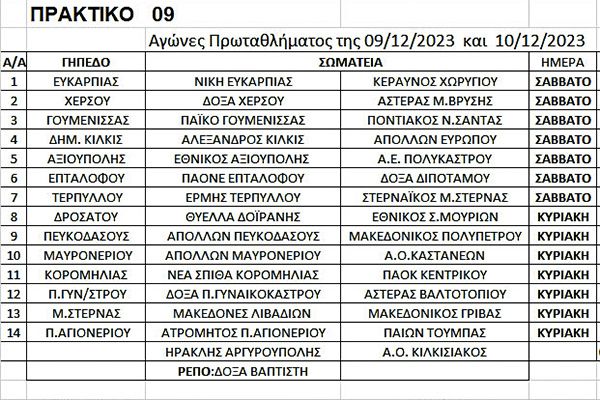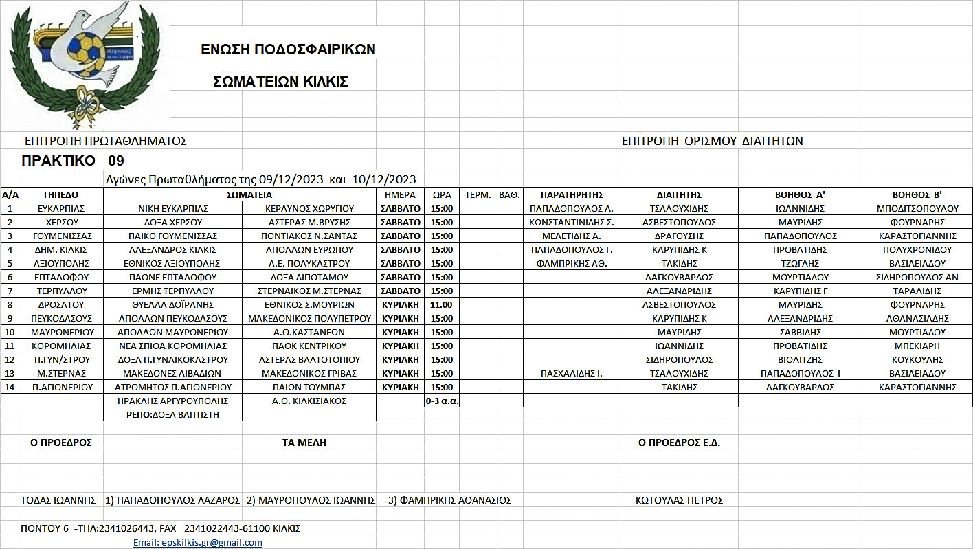 Από την Επιτροπή Ορισμού Διαιτητών της ΕΠΣ Κιλκίς ορίσθηκαν οι παρατηρητές και οι διαιτητές που θα διευθύνουν τους αγώνες της Α1 και Α κατηγορίας το Σάββατο 9 και την Κυριακή 10 Δεκεμβρίου 2023, στις 3 το απόγευμα, όπως καταγράφονται στο σχετικό πίνακα στην ΕΚΘΕΣΗ ΕΙΚΟΝΩΝ.