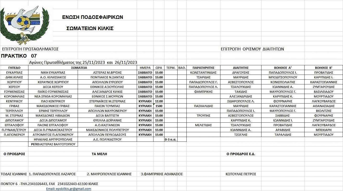 Από την Επιτροπή Ορισμού Διαιτητών της ΕΠΣ Κιλκίς ορίσθηκαν οι παρατηρητές και οι διαιτητές που θα διευθύνουν τους αγώνες του σαββατοκύριακου, 25 και 26 Νοεμβρίου 2023, στις 3 το απόγευμα, όπως καταγράφονται στο σχετικό πίνακα στην ΕΚΘΕΣΗ ΕΙΚΟΝΩΝ.