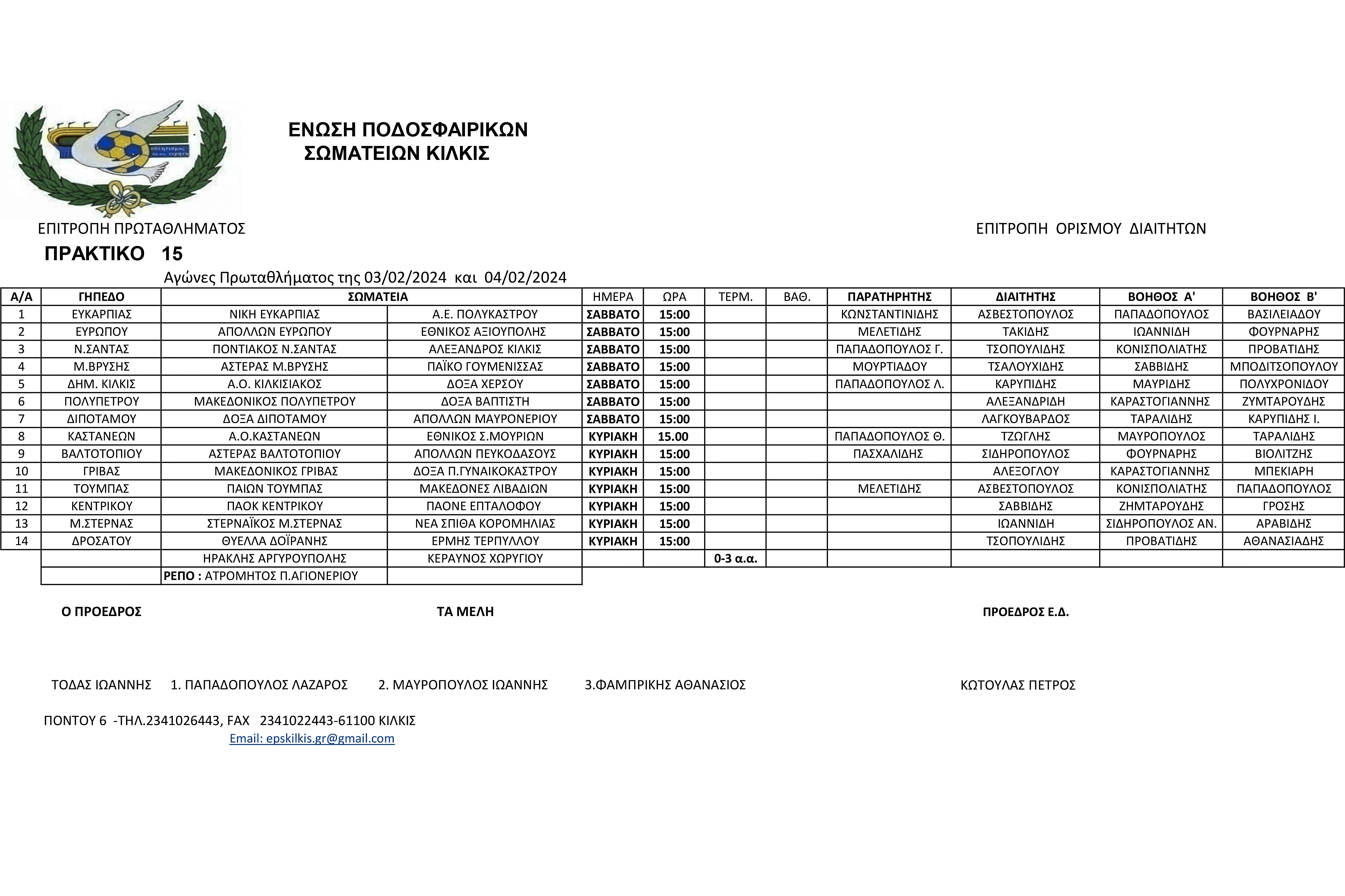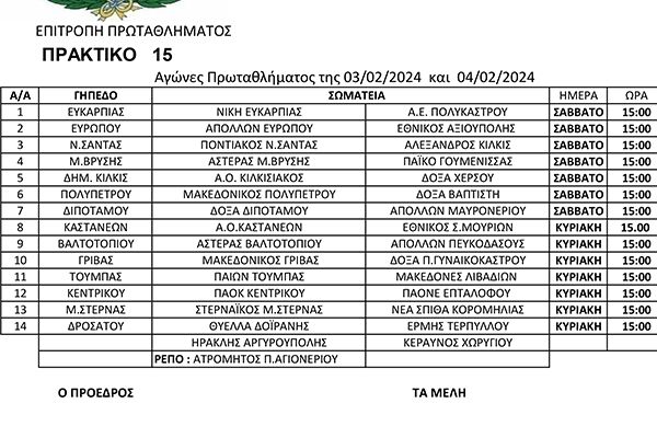 Από την Επιτροπή Ορισμού Διαιτητών της ΕΠΣ Κιλκίς ορίσθηκαν οι παρατηρητές και οι διαιτητές που θα διευθύνουν τους αγώνες του σαββατοκύριακου, 3 και 4 Φεβρουαρίου 2024, στις 3 το απόγευμα, όπως καταγράφονται στο σχετικό πίνακα στην ΕΚΘΕΣΗ ΕΙΚΟΝΩΝ.