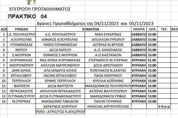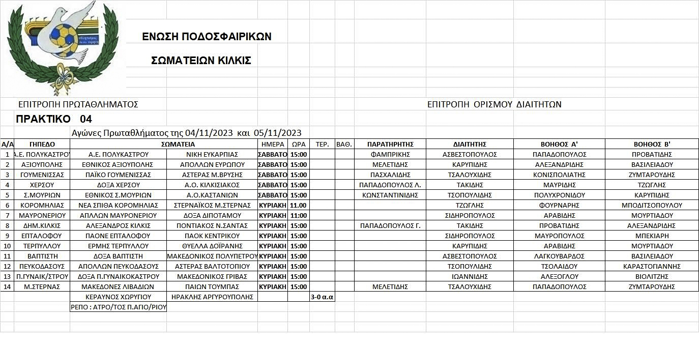 Από την Επιτροπή Ορισμού Διαιτητών της ΕΠΣ Κιλκίς ορίσθηκαν οι παρατηρητές και οι διαιτητές που θα διευθύνουν τους αγώνες του σαββατοκύριακου, 4 και 5 Νοεμβρίου 2023, στις 3 το απόγευμα, όπως καταγράφονται στο σχετικό πίνακα στην έκθεση εικόνων.