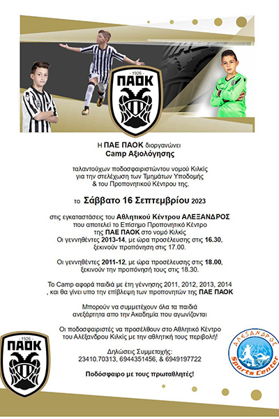 Το Σάββατο 16 Σεπτεμβρίου πραγματοποιείται το πρώτο προπονητικό Camp της ΠΑΕ ΠΑΟΚ, στο επίσημο αθλητικό κέντρο του δικέφαλου του βορρά στο Κιλκίς το Alexandros Sports Center.